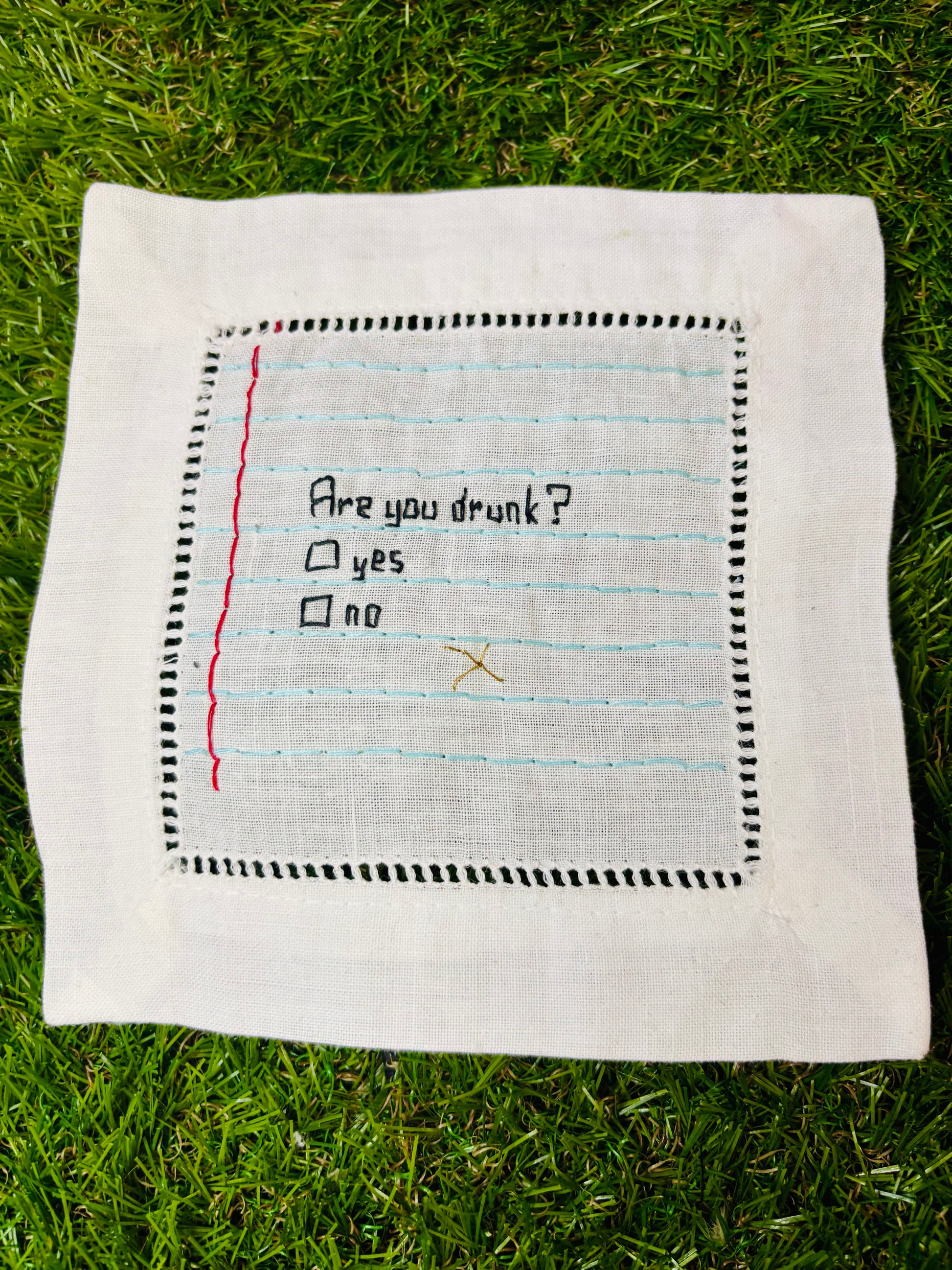 Confess your truth (or deny it!) with these hilariously chic cocktail napkins. Crafted from crisp white linen, each square napkin features a meticulously hand-stitched "Are you drunk?" questionnaire. One napkin boldly declares "Yes" with a stitched "X," while its counterpart insists "No." The playful design is complete with embroidered lined paper detailing and a classic border.