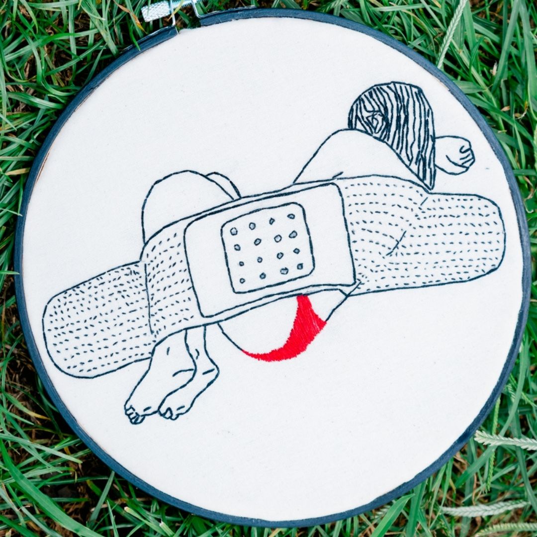 - Inspired by the art of Henn Kim, girl laying wrapped in bandaid blanket